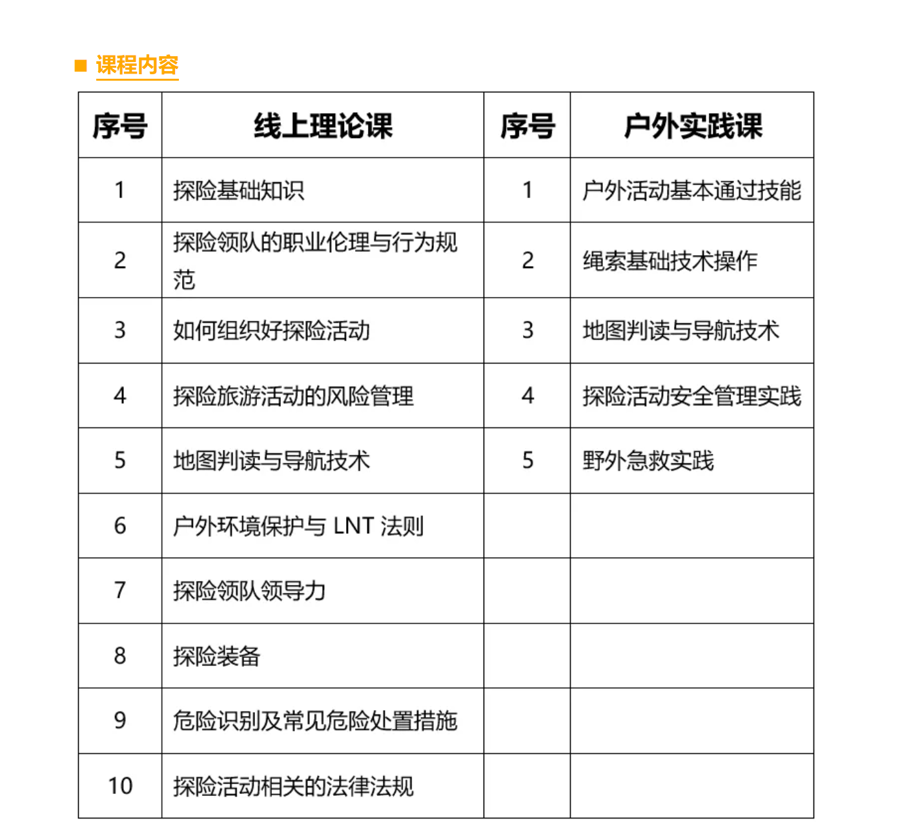 其实,专业机构对户外活动领队有培训课程。以初级探险领队培训为例,要经过线上理论课和户外实践课等多个课时学习,须掌握探险基础知识、风险管理、地图判读、导航技术、野外急救等多项技能。
