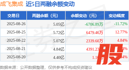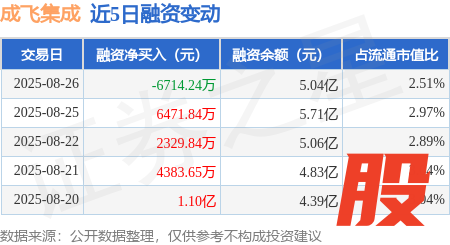 本站消息,8月26日,成飞集成(002190)融资买入3.65亿元,融资偿还4.32亿元,融资净卖出6714.24万元,融资余额5.04亿元,近20个交易日中有11个交易日出现融资净买入。